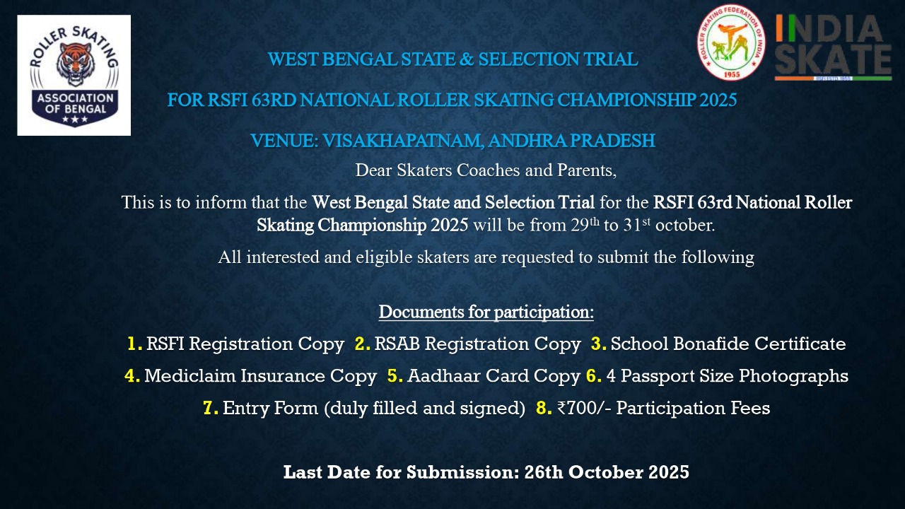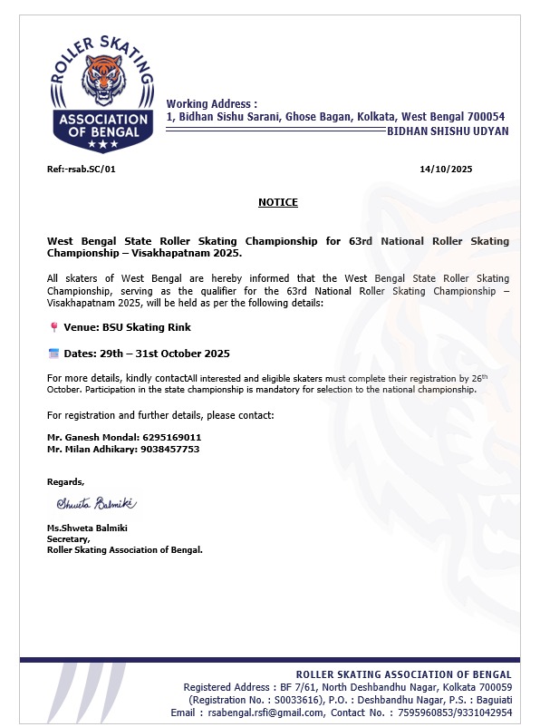 Roller Skating Association of Bengal(RSAB) is the governing body for Roller Skating in West Bengal, based in Kolkata, RSAB is an association registered under West Bengal Societies Registration Act 1961. RSAB has 10 District Associations.